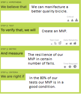 Without the required control the entrepreneur would have spent 10300€ in his attempt to sell a bike, while with the “Assumption Validation” process in case of non-verification he would have spent 550€ (so resources are saved) and he would have learnt that he needs to pivot.